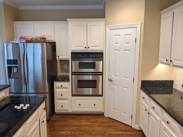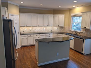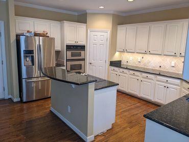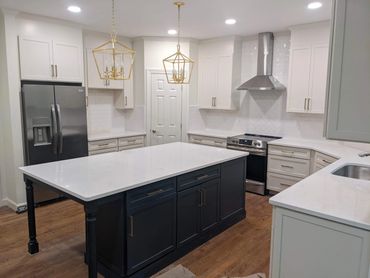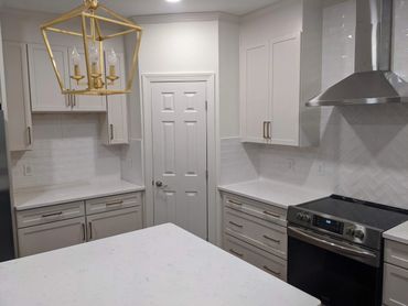 Step into this beautifully renovated kitchen, featuring sleek custom cabinetry, pristine white quartz countertops, and a stylish herringbone pattern subway tile backsplash. State-of-the-art stainless steel appliances and elegant gold pendant lights make this kitchen a true centerpiece of the home.